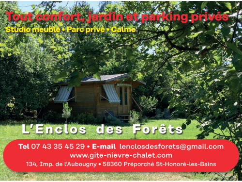 À 1,8 km de St-Honoré-les-Bains, charme et calme, dans parc clos et privé de 1650 m², partiellement boisé, un chalet indépendant de 20 m², + 25 m² de jardin attenant privé, équipé, + parking inclus et privé ; studio/chalet, avec douche, WC séparés, vasque sur plan, petit rangement. Le coin Sommeil avec un grand lit 140x190, équipé d'un confortable matelas de marque Bultex en 25 cm d'épaisseur ; les draps sont inclus, le lit est prêt à votre arrivée.
